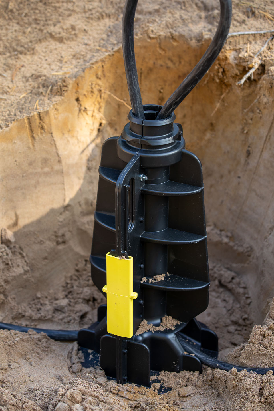 För en säker och hållbar förläggning. Snabb och enkel installation för montering på Ø 60 mm stolprör. Tillverkad av 100% återvunnen plast, betydligt lättare än motsvarande betongfundament.